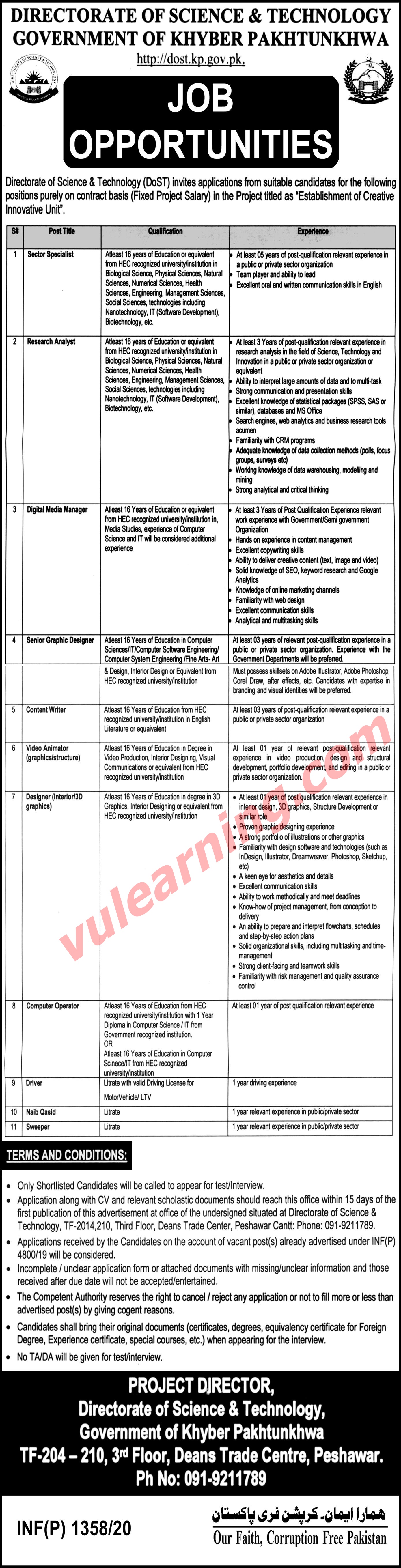 Directorate of Science & Technology Government of Khyber Pakhtunkhwa Jobs 2020